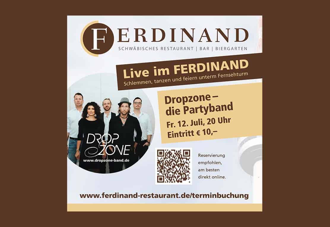 Schlemmen, tanzen und feiern unterm Fernsehturm: Die Stuttgarter Coverband Dropzone live im Restaurant Ferdinand am 12. Juli 2024.